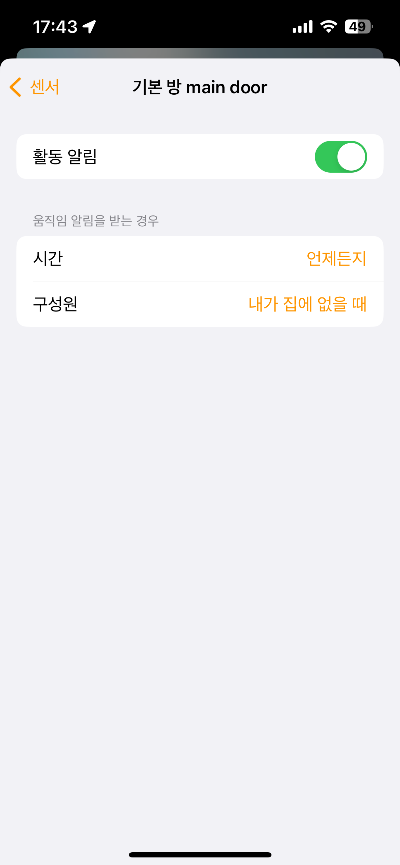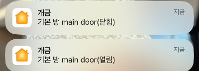 하면 해당과 같이 홈킷 앱 내 설정에서 도어센서관련 악세사리를 확인할 수 있으며 사용자 편의에 따라 자동화할 수 있겠습니다.